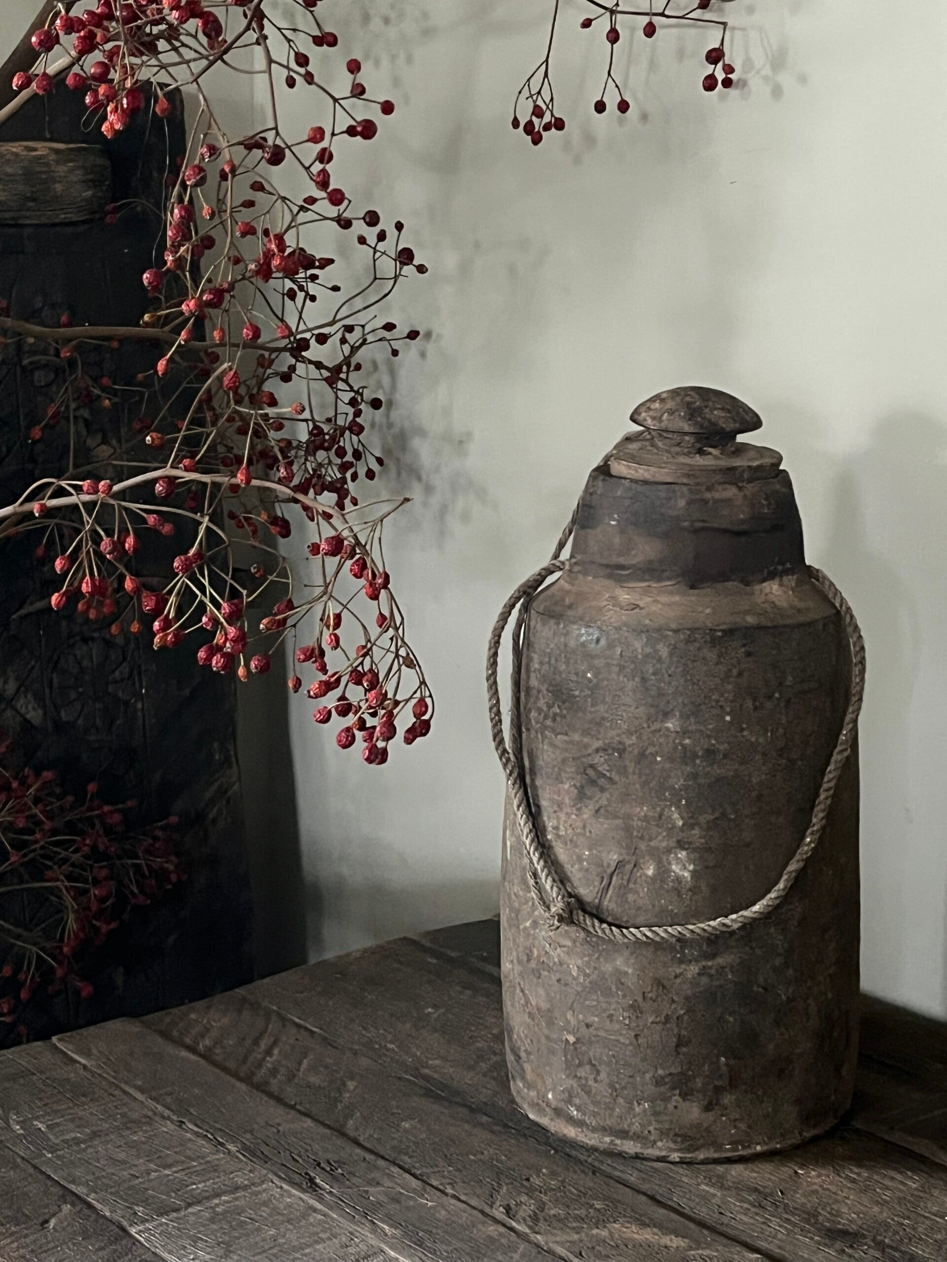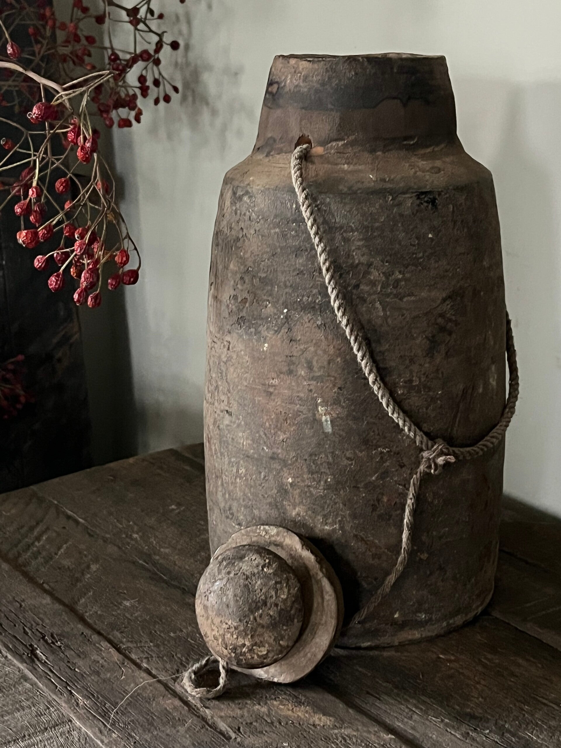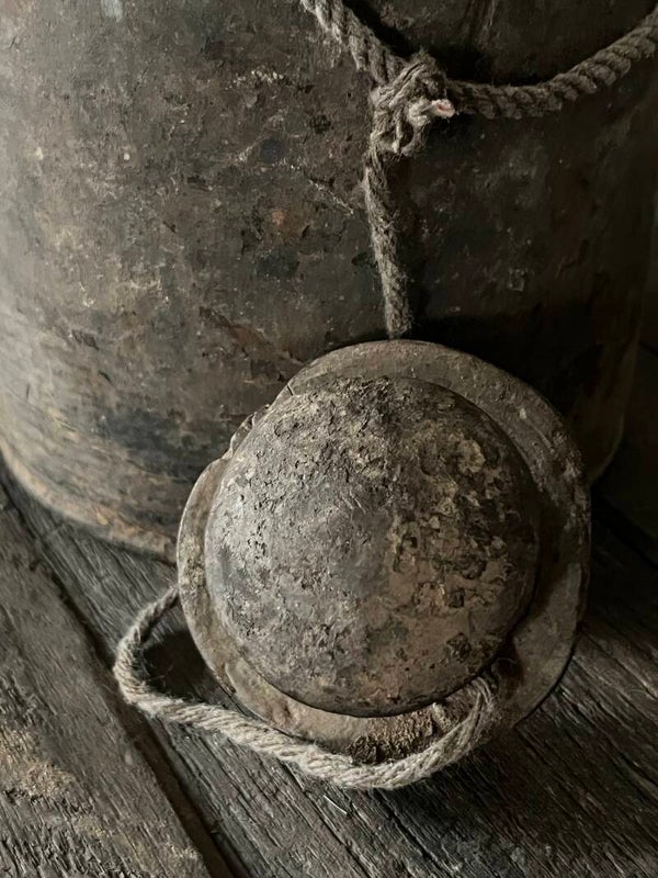 Prachtige nepalese kruik met een mooi sober patina met touw en deksel!