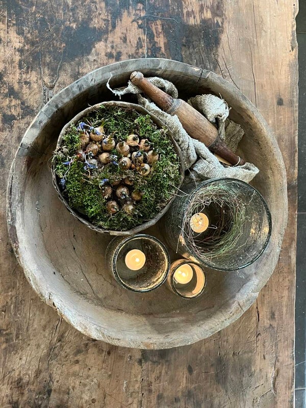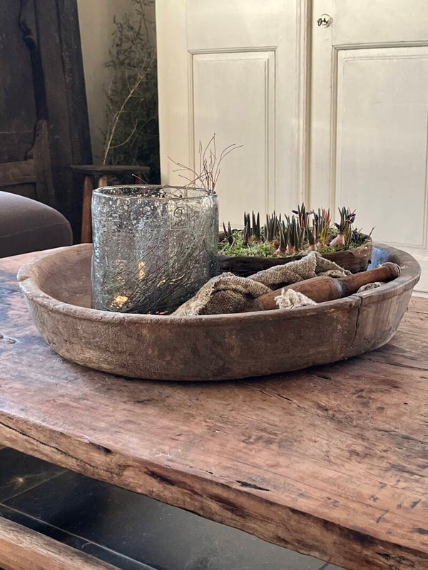 Deze stoere en sleetse schaal staat mooi met bv een aantal windlichten, kandelaar, kruikjes etc.