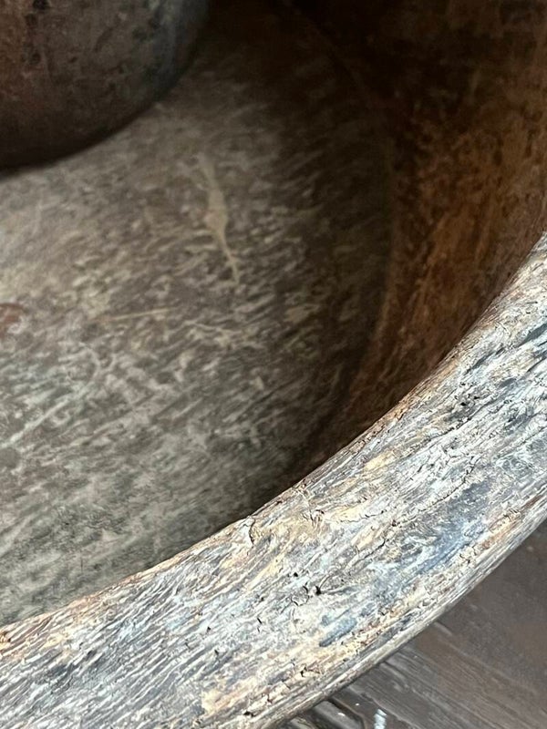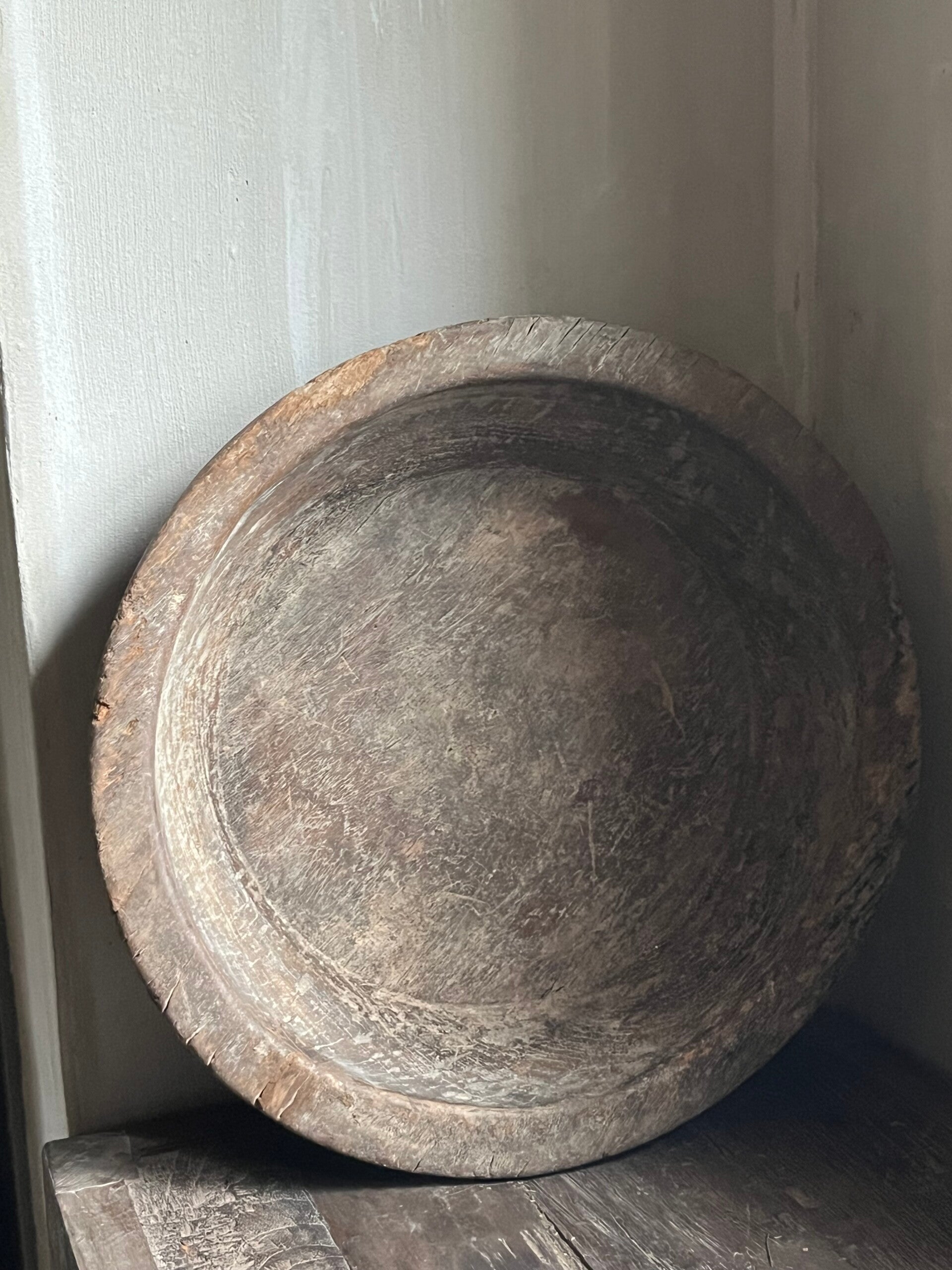 prachtige grote houten sleetse schaal met een grote vlakke bodem
