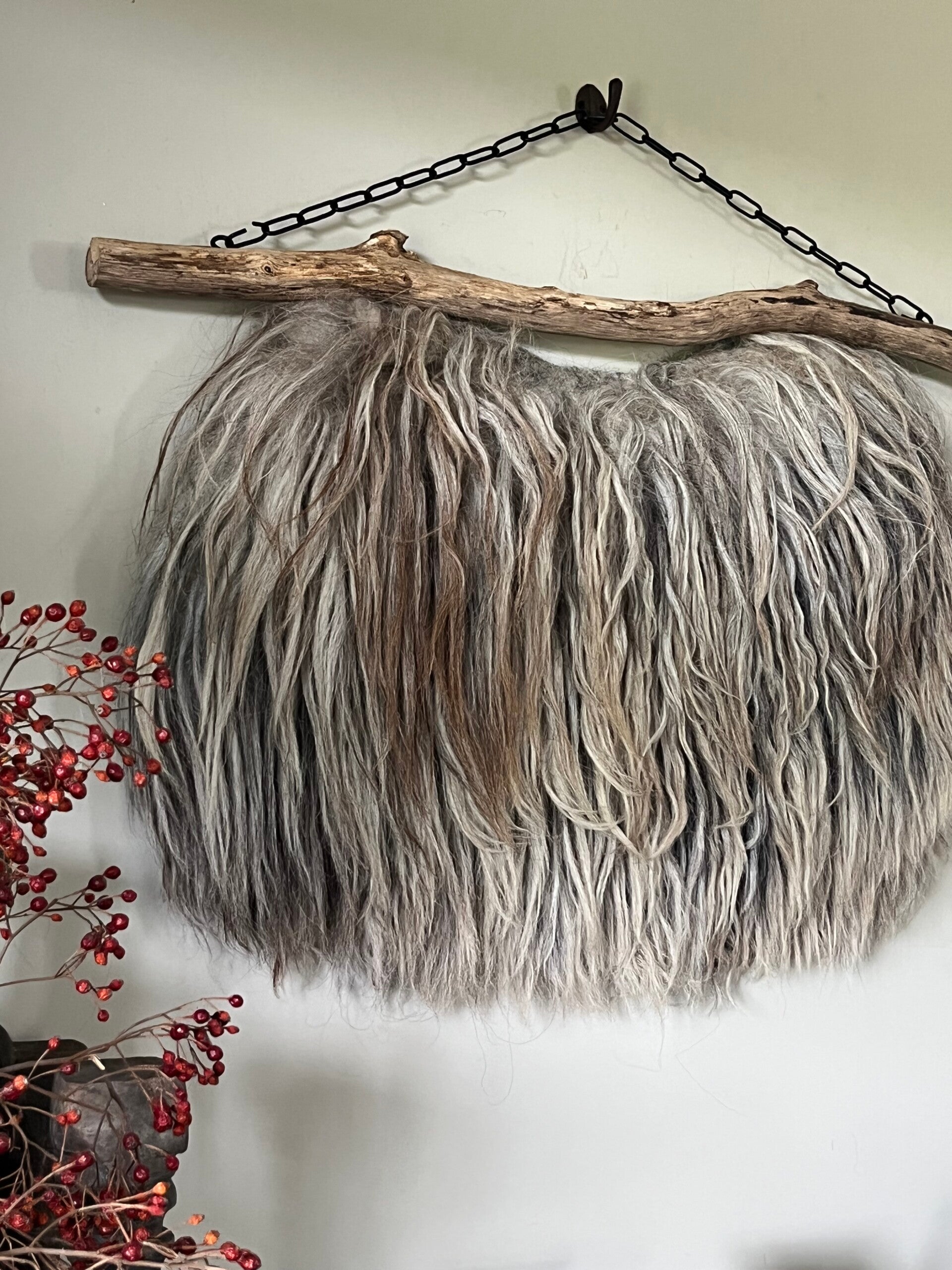 ik vind een vacht kopen via internet, zo op afstand wel een dingetje 😂 door de lens is het toch moeilijk de kleur echt te vangen maar ook de structuur en hoe hij voelt, het beste kan je dat in levende lijven zien want alle wolproducten kunnen niet retour! Houdt daar a.u.b. rekening mee. U bent van harte welkom om eerst, natuurlijk vrijblijvend, deze wandhanger van schapenwol in het echt zien. Stuur mij even een whatsapp berichtje of ik thuis ben of wanneer je langs wil komen, je bent altijd welkom, ook in de avonden of in het weekend! Mocht het toch niet lukken om langs te komen, maar wil je een extra filmpje stuur mij dan ook een berichtje.