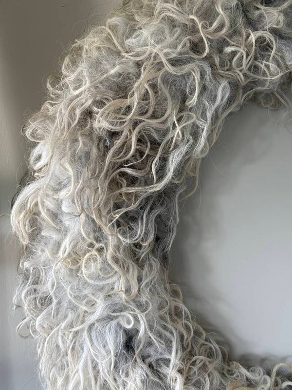 De wol is gewassen voordat de krans gemaakt is, dus stinkt niet!
