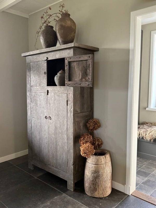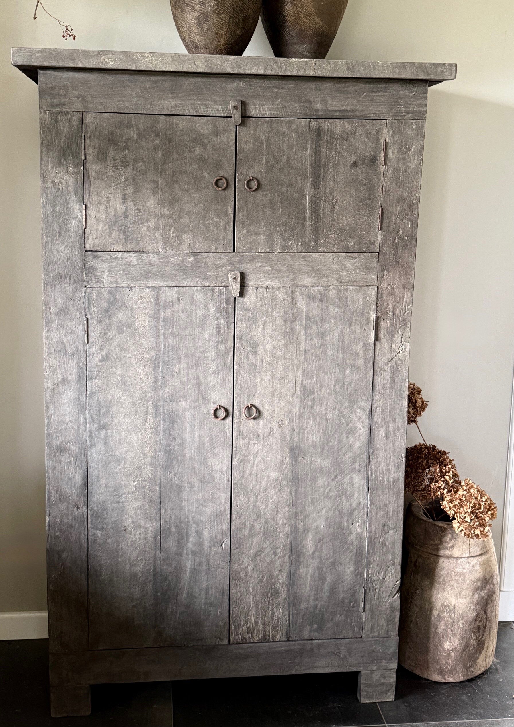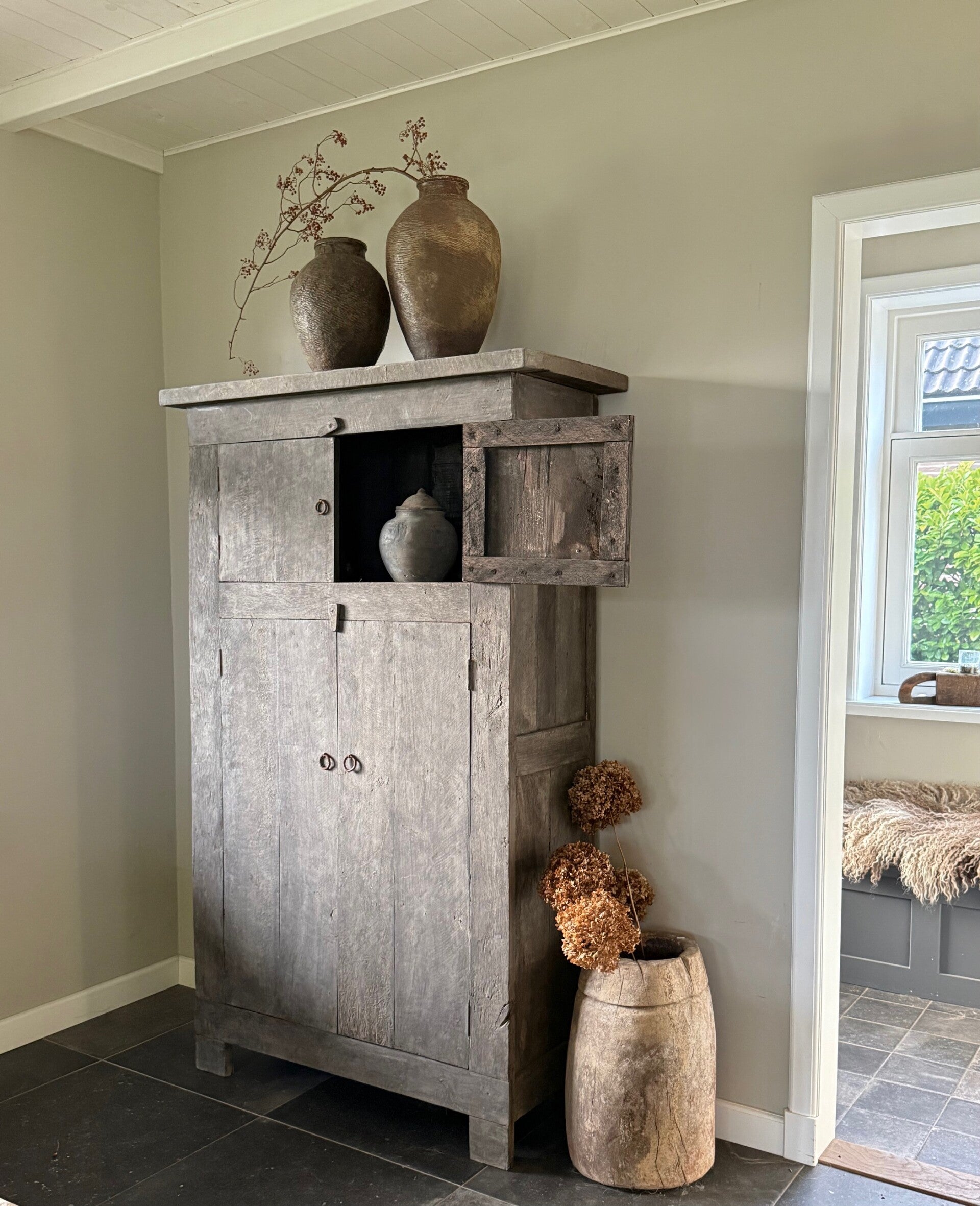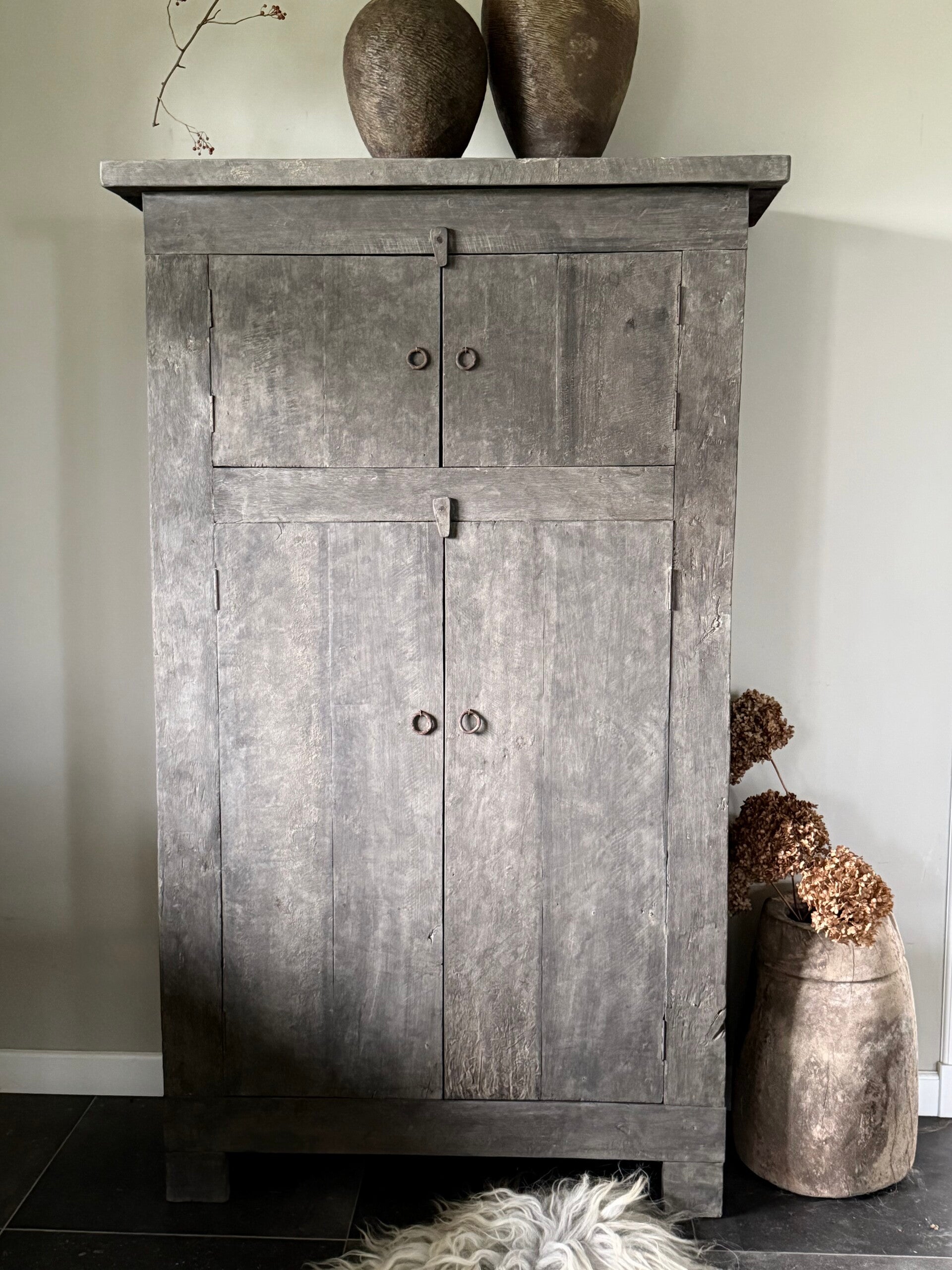 Stoere kast, deze kast van de old barn serie heeft 4 deuren en de stoere schuifsluiting. Zo mooi om bv een deurtje bovenin open te laten staan zodat je daar mooie items kan plaatsen
