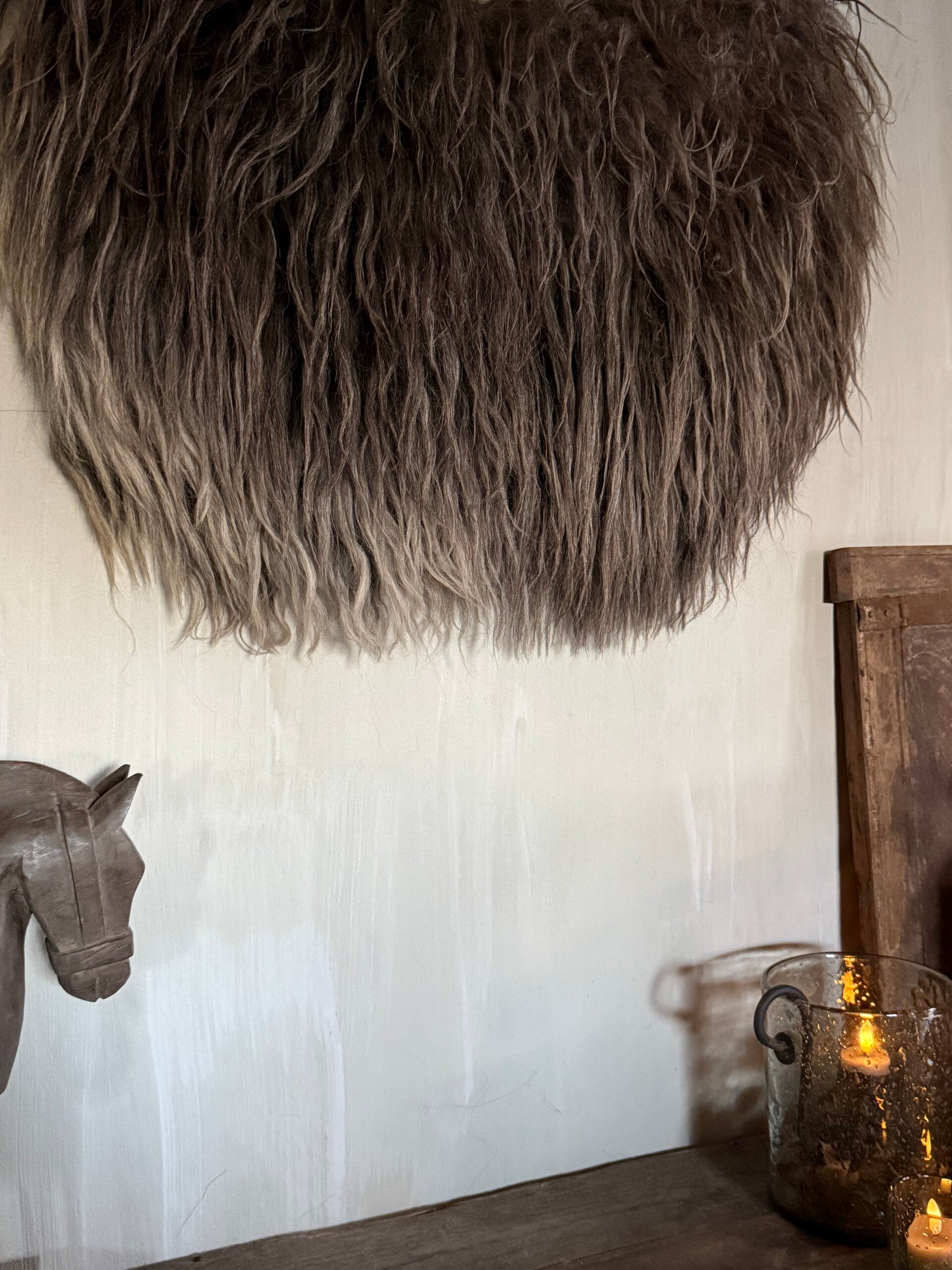 Deze wandhanger / wandkraag is een unieke wanddecoratie. ( er is eventueel een bijpassend, van dezelfde vacht een decovachtje beschikbaar)