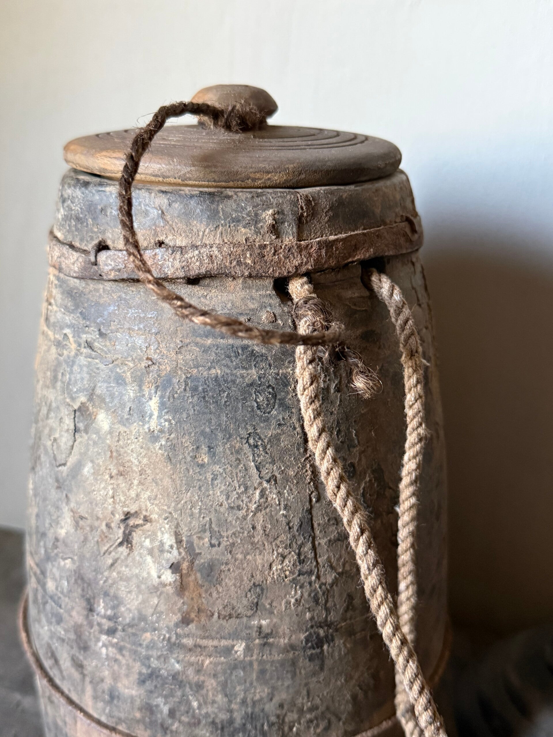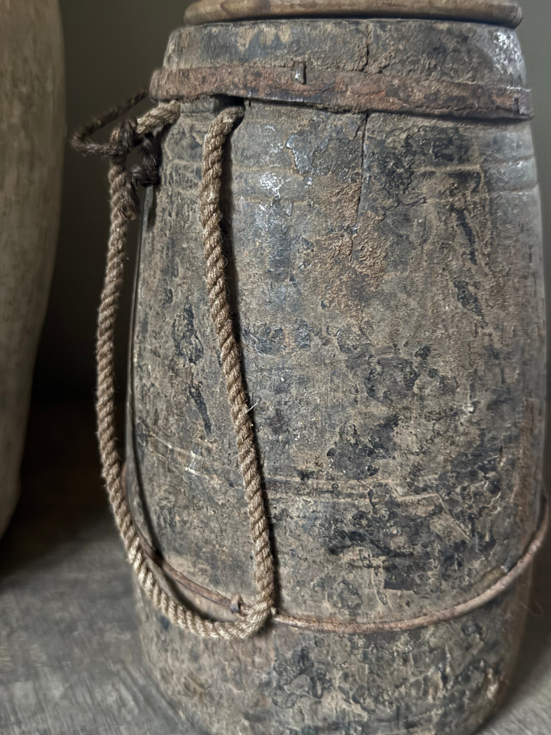 Prachtige nepalese kruik met een mooi sober patina met touw, deksel en subtiel oude ijzerdetails zoals de band!