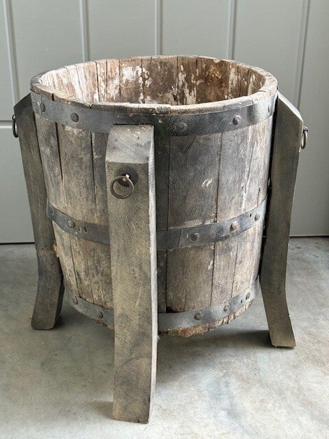 vergrijsde houten bak op pootjes. Leuk voor onder de veranda met plantjes, naast de openhaard met houtblokken of met een mooie plant of olijfboompje.