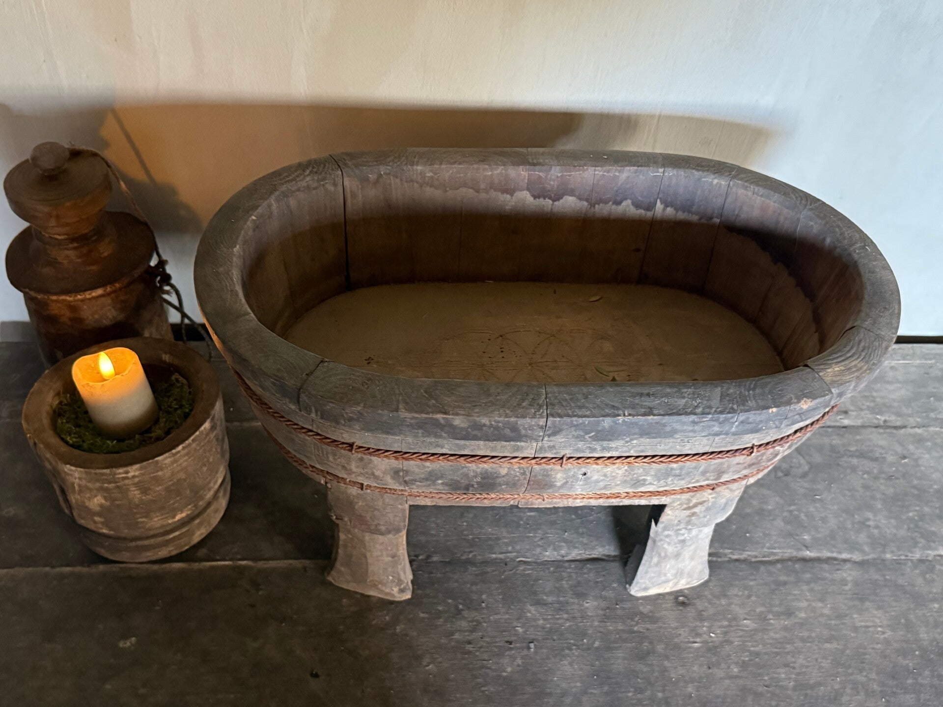 Het is een oud item met de mogelijk daarbij behorende imperfectie, houd daar rekening mee. Dit geeft juist de sfeer van stoer, sober en landelijk.