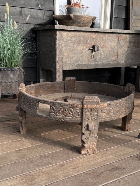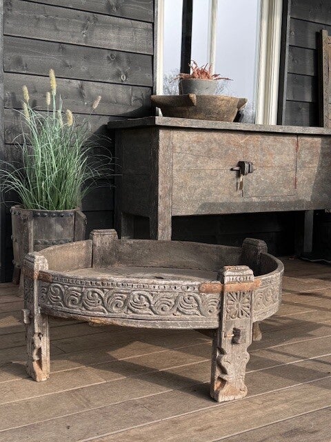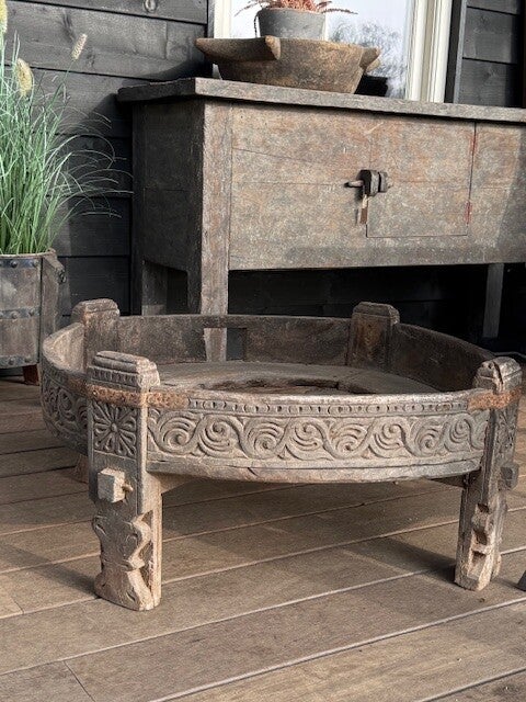 Gave chakkitafel uit India. Nu open heel mooi, maar hier kan je natuurlijk ook een grote schaal of pot/kruik inzetten, of een kussen erin als je het als hondenmand bv wil gebruiken.